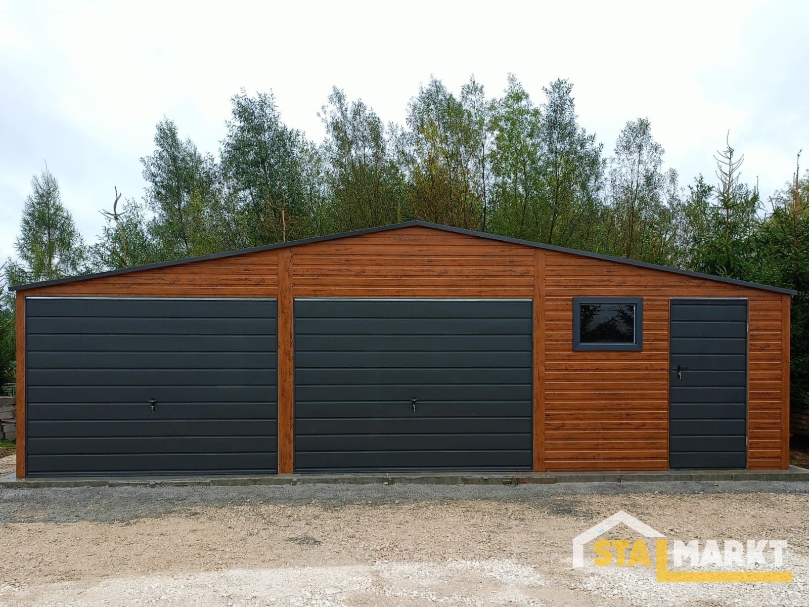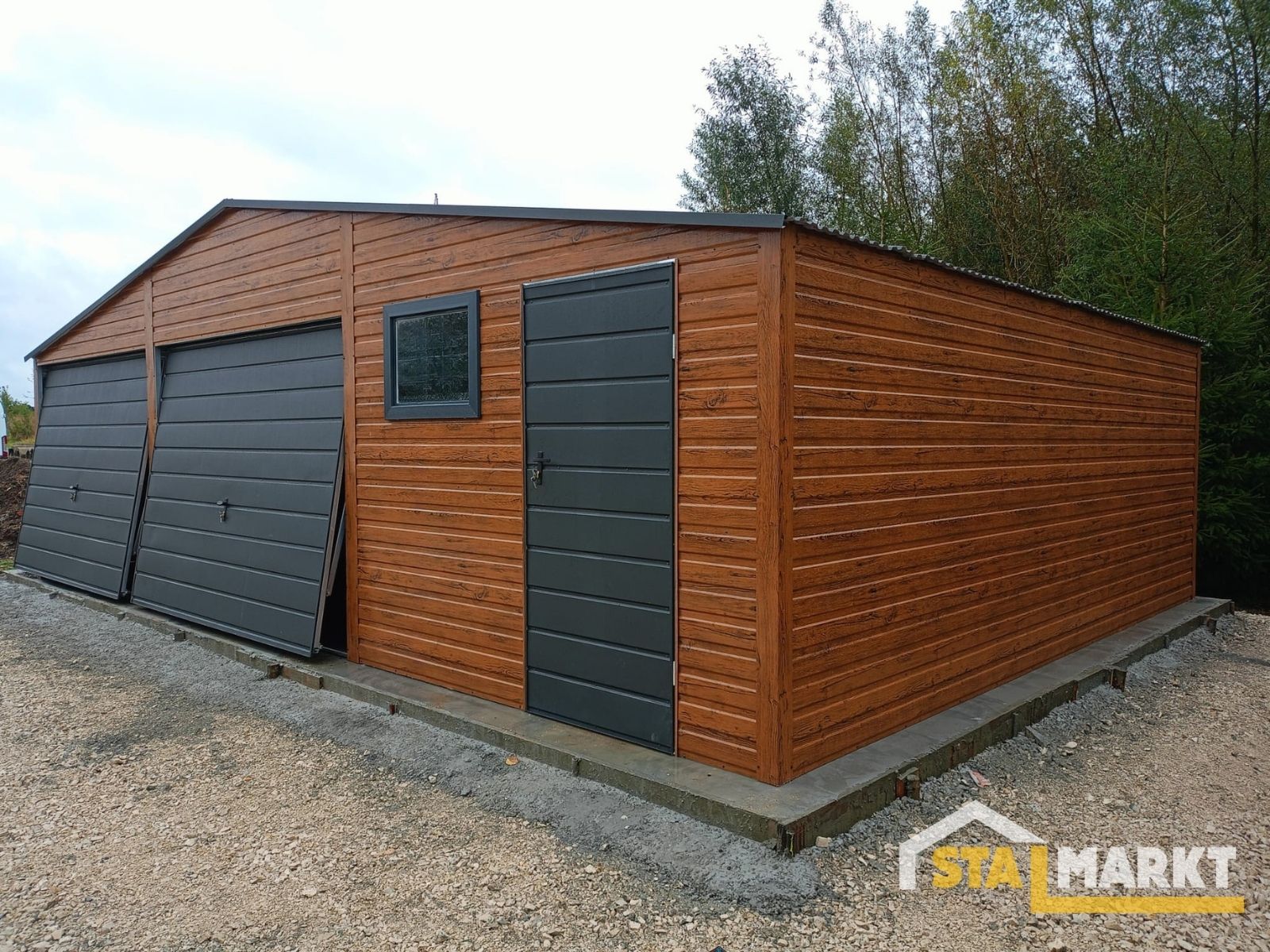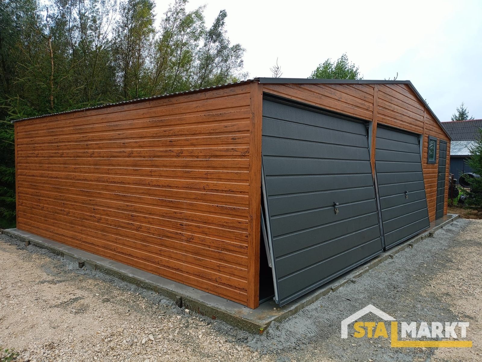 Nowoczesne wykończenie w kolorze drewna, solidna konstrukcja i wygodny układ z bramami oraz drzwiami bocznymi zapewniają komfort użytkowania i trwałość na lata. Idealne rozwiązanie dla tych, którzy chcą połączyć estetykę z funkcjonalnością.